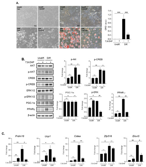 The effect of 7,8-DHF (BDNF mimetic) treatment in undifferentiated and differentiated 3T3-L1 adipocyte cells. (A) adipocyte differentiation and lipid accumulation by Oil red O staining, (B) protein expression related to adipocyte differentiation, (C) mRNA expression of genes involved in body fat-browning. Means ± S.E. tested by independent t-test (nonparametric). * p < 0.05, ** p < 0.01, *** p < 0.001, n.s.: no significance; 5 μg/mL treatment of 7,8-DHF; undiff: undifferentiated cells, diff: differentiated cells.