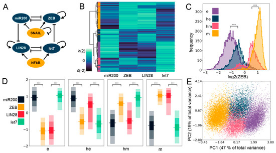 Four phenotypes enabled by the coupled Epithelial Mesenchymal Plasticity (EMP)–stemness circuit. (A) The core EMP–stemness circuit (base circuit). Arrows represent activating links and hammerheads represent inhibitory links. (B) Heatmap showing the steady-state expression of all solutions of a single replicate including the core EMP (ZEB, miR-200) and stemness (LIN28, let-7) nodes. (C) Expression histograms (all solutions from a single Random Circuit Perturbation (RACIPE) replicate. For n = 5, see Supplementary Table S2 in Section S2.1) showing ZEB levels in the four clusters—epithelial (e), hybrid epithelial (he), hybrid mesenchymal (hm), and mesenchymal (m). The colors of the labels shown in the heatmap are for e, he, hm, and m clusters displayed here. (D) Expression levels of EMP and the stemness genes in the four clusters. In each node, the horizontal line represents the median value, the darkest region represents the middle 30% (35th to 65th percentile) of the data, and the region next in lightness represents the next 40% (15th to 35th and 65th to 85th percentiles), while the lightest region represents the next 20% of the data (5th to 15th and 85th to 95th percentiles) (E) Principal Component Analysis (PCA) plot colored according to the K-means cluster assignment. (Principal Component 1 (PC1) = 0.48 × miR200 − 0.54 × ZEB − 0.21 × SNAIL − 0.49 × LIN28 + 0.44 × let7 + 0.057 × NF-kB; Principal Component 2 (PC2) = 0.27 × miR200 − 0.08 × ZEB − 0.66 × SNAIL + 0.14 × LIN28 − 0.49 × let7 − 0.47 × NF-kB). For (C,D): Significance bars added to show statistically significant differences (Mann–Whitney U test). Legend for the p-values: *** p < 0.0001; for effect sizes, refer to Table S7 in Supplementary Section S2.5.