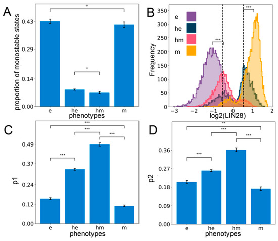 The gene regulatory network involving the interplay between E/M plasticity and stemness can give rise to different phenotypes (steady states). Next, we investigated whether these states can co-exist for certain parameter sets, i.e., is the network capable of exhibiting multistability? Out of the ensemble of parameter sets sampled by RACIPE, we observed that a subset of parameter sets can give rise to a combination of two or more steady states per parameter set (bistability: 37.3 ± 0.95%, tristability: 24.2 ± 0.09%, etc.), while the others converged to a single steady state for the given system of ordinary differential equations (monostability: 29.6 ± 0.70%). A closer inspection of the monostable solutions revealed epithelial (e) and mesenchymal (m) states as the most predominant solutions (Figure 2A), indicating that epithelial and mesenchymal phenotypes are more likely to exist relative to the hybrid ones, thereby reminiscent of observations based on the modeling of larger EMP regulatory networks too [44,45]. This trend is also observed when considering all the solutions together irrespective of the number of states (Table S5). Consistently, among all possible bistable solutions, the most predominant one is the phase {e, m}, i.e., the co-existence of epithelial and mesenchymal states (Figure S3A). The least frequent bistable phase is {he, hm}, i.e., the one with the co-existence of both hybrid phenotypes, while the frequency of bistable phases containing one hybrid phenotype and one of the epithelial or mesenchymal ones—{e, hm}, {he, m}, {e, he}, {m, hm}—is intermediate (Figure S3A). Similarly, among all possible tristable solutions, the phases containing both epithelial and mesenchymal states—{e, he, m} and {e, hm, m}—were the most predominant (Figure S3B). Put together, these results indicate that the coupled EMP–stemness regulatory network is multistable and therefore allows for cells to switch among the epithelial, mesenchymal, and the hybrid phenotypes due to stochastic perturbations.