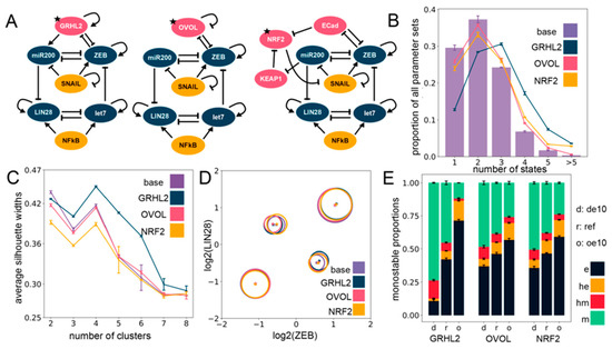 The following are available online at https://www.mdpi.com/2077-0383/10/1/60/s1, Figure S1: Optimal cluster number by varied cluster quality, Figure S2: Four E/M phenotypes enabled by the base circuit, Figure S3: Stemness window and the bistable/tristable phase distributions of the coupled EMP–stemness circuit, Figure S4: Link strength analysis, Figure S5: Distribution of bistable and tristable systems upon incorporating PSFs with the coupled EMP–stemness circuit, Figure S6: Stemness probability (p1) changes with PSF expression, Figure S7: PSF expression profiles at different expression levels, Figure S8: GRHL2-KD circuit results for the investigated quantities, Figure S9: Shifted Hill function across different parameters, Table S1: Parameters ranges and the simulation options, Table S2: Median (iqr) for ZEB and LIN28 in different replicates of the base circuit rounded off to 3 significant figures, Table S3: Average Silhouette widths for the Uncoupled E/M and Stemness circuits, Table S4: Proportion (averaged across all replicates) of filtered x-stable parameter sets based on > 1 solutions of the set being assigned the same phenotype (standard deviations in the parentheses), Table S5: Proportion (averaged across all replicates) of all solutions irrespective of the number of stable states of the corresponding parameter set belonging to different phenotypes (with standard deviations in parenthesis), Table S6: Statistical Testing results for differences of various calculated proportions in the base circuit considering all the replicates (i.e., the proportion calculated for the 5 replicates forms one comparison group), Table S7: Statistical Testing results for differences of the node distributions across the clusters for a single replicate of the base circuit, Table S8: Statistical Testing results for the PSF circuits with the proportions calculated for all the replicates of the de10 circuit forming one comparison group while the proportions of all the replicates of the oe10 circuit forming the other comparison group, Table S9: p1 and p2 for solutions of multi-stable systems (after removing monostable systems), Table S10: Different configurations of the association of stemness with the different phenotypes in bistable phases for base circuit, Table S11: Different configurations of the association of stemness with the different phenotypes in tristable phases for base circuit, Table S12: Different configurations of the association of stemness with the different phenotypes in bistable phases for GRHL2 circuit (reference un-perturbed), Table S13: Different configurations of the association of stemness with the different phenotypes in tristable phases for GRHL2 circuit(reference un-perturbed), Table S14: Different configurations of the association of stemness with the different phenotypes in bistable phases for OVOL circuit(reference un-perturbed), Table S15: Different configurations of the association of stemness with the different phenotypes in tristable phases for OVOL circuit(reference un-perturbed), Table S16: Different configurations of the association of stemness with the different phenotypes in bistable phases for NRF2 circuit(reference un-perturbed), Table S17: Different configurations of the association of stemness with the different phenotypes in tristable phases for NRF2 circuit(reference un-perturbed).