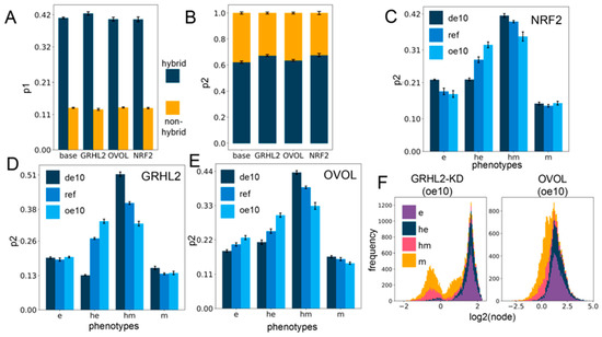 In addition to being thought of as PSFs, GRHL2 and OVOL1/2 have been considered as Mesenchymal-Epithelial Transition (MET)-inducing transcription factors (MET-TFs), as their overexpression in carcinomas is capable of upregulating the expression levels of E-cadherin and/or revert EMT [50,51,52,53,54] as well as other EMT-associated traits, such as anoikis resistance, metabolic reprogramming [55], and immune evasion [56]. This observation is consistent with their knockdown known to drive a “full” EMT in both cancer cell lines and in developmental contexts [46,49]. Thus, with the goal to identify the effect of overexpression and downregulation of these PSFs on relative proportions of the different EMPs, we quantified the changes in the frequency of different monostable solutions—e, m, he, and hm—upon a 10-fold over-expression (oe10) and a 10-fold down-expression (de10) of these PSFs. Computationally, this provides a dynamically consistent way to characterize the effect attributable to any node on the network dynamics and RACIPE implements this perturbation by altering the rate of production of the specific node (see Section 4). We observed that increasing the expression of any one of the three PSFs enriched the epithelial (e) phenotype at the expense of the mesenchymal (m) phenotype. Similar, albeit weaker, trends were seen for an enrichment of the he phenotype at the expense of the hm phenotype (Figure 3E). This effect was more pronounced in the GRHL2 case in comparison to either OVOL or NRF2 (Figure 3E). This trend is also present overall not only for only monostable solutions, but also for all parameter sets considered together (see Supplementary Section S2.4).