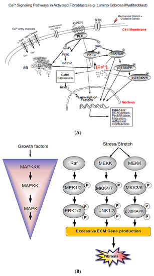 Fibrosis is a molecular process defined by the accumulation of excess of ECM which ultimately damages the connective tissue leading to impairment of normal function; it occurs in multiple tissues and organs including heart, kidney, lung, skin, liver [7,8,9], pancreas, intestine, and eye [10,11]. Fibrosis is the result of tissue stiffening caused by the excess deposition of ECM proteins in response to chronic inflammation, provoked by different stimuli such as hypoxia, oxidative stress, mechanical stretch, and growth factors (e.g., TGFβ). These stimuli can promote fibroblasts to proliferate, migrate, and acquire an activated phonotype change into myofibroblasts contributing to further tissue remodeling and subsequently fibrosis [10]. The transition of a normal fibroblast to a myofibroblast cell also involves altered expression of various proteins required in calcium (Ca2+) regulation and signaling, including protein kinase C (PKC) and mitogen-activated protein kinase (MAPKs) [12]. Therefore, aberrant elevation of intracellular [Ca2+]i levels may lead to cell proliferation and thus contribute to fibrosis and carcinogenesis [13]. It has been shown in cancer cells that the mechanism behind Ca2+-induced cell proliferation is caused by the opening of Ca2+ channels allowing Ca2+ entry, followed by downstream activation of the MAPKs pathway promoting cell proliferation [14].