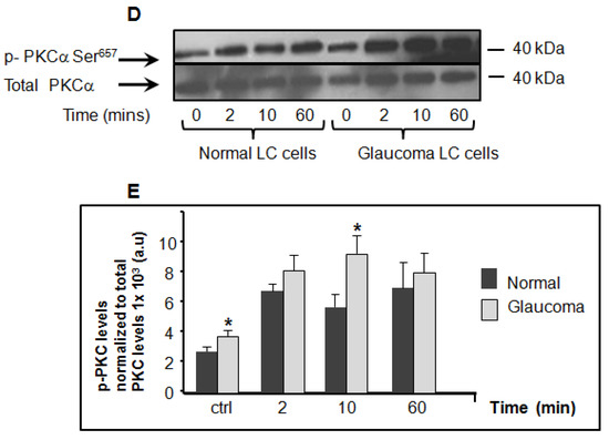 The induction of PKCα expression and activity using hyposmotic-induced cellular swelling to model glaucoma has not been reported in LC cells. Here, we performed a time-course study wherein we examined the expression/activity of PKCα in normal and glaucoma LC cells cultured under resting (isotonic) conditions and stimulated with hyposmotic-induced cellular swelling solution. Figure 2 shows that when LC cells are incubated in isotonic physiological solution, the basal expression level of PKCα was significantly greater in glaucoma LC cells (3.08 ± 0.48, p-PKCα levels normalized to total PKCα levels 1 × 103 a.u (arbitrary units)) versus normal LC cells (1.92 ± 0.49, p-PKCα levels normalized to total PKCα levels 1 × 103 a.u), (n = 3 independent experiments; * p = 0.0324), (Figure 2A–C). When LC cells are treated with hyposmotic-induced cellular swelling solution, the activity of PKCα, was found to be significantly (p < 0.05) increased in glaucoma LC cells versus normal LC cells at the matched time-points of 1, 5, 10, and 30 min, but not at the matched time-points of 2 and 20 min (Figure 2A–C). Exposure of LC cells to hyposmotic solution activates phosphorylation of PKCα in both normal and glaucoma LC cells. The PKCα activation was biphasic and peaked at time-points of 2 min and 10 min. Figure 2D (representative Western blot), and Figure 2E (average data from 3 independent experiments), show a time-course experiment, using time-points where PKCα reached the maximum peak (2 min and 10 min) as shown in Figure 2A,B and the exposure to hypotonic solution was extended to 1 h. We found that the hypotonic cell stretch-induced phosphorylation of PKCα stayed above basal level for at least 1 h of observation (Figure 2D,E).