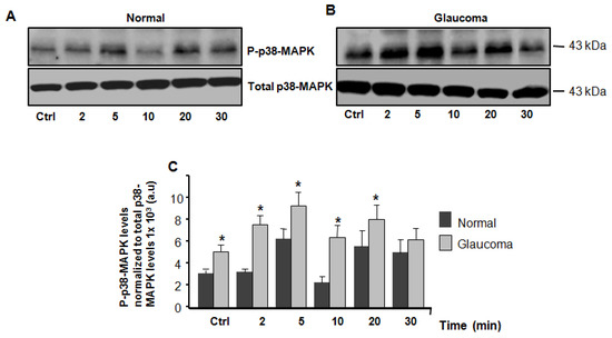 Western blot analysis of total and phospho-p38-MAPK in normal and glaucoma LC cells. Equal amounts of cellular proteins (20 μg/lane), were separated on a 10% electrophoresis gel, transferred to a nitrocellulose membrane, and immunoblotted with a 1:1000 dilution of phospho and total antibodies specifically directed against p38-MAPK, respectively. (A), (Top left panel), representative p38-MAPK Western blot of LC cells exposed to isotonic physiological solution (for at least 15 min to obtain a stable baseline) and (B), (Top right panel), LC cells treated with hyposmotic solution at time-points of 2, 5, 10, 20, and 30 min. (C) Averages ± SE of at least three biological replicates comparing the expression and activity of p38-MAPK in normal and glaucoma LC cells. * p < 0.05 was compared with time-matched controls (100%). Average data of expression and activity (phosphprylation) levels of p38-MAPK were normalized to total p38-MAPK levels. There was a significant increase in phosphorylated p38-MAPK (p−p38-MAPK) protein expression at basal conditions (Ctrl) and p38-MAPK activity (phosphorylation) at time-points of 2, 5, and 10 min, but no significant increase in p38-MAPK activity was found at 20 and 30 min after exposure to hyposmotic solution.