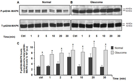 Western blot analysis of total and phospho-p42/44-MAPK in normal and glaucoma LC cells. Equal amount of 20 μg/lane of cell protein was loaded, separated on a 10% electrophoresis gel, transferred to a nitrocellulose membrane, and immunoblotted with phospho p42/p44-MAPK (p−p42/44 MAPK) and total (p−p42/44 MAPK) primary antibodies, respectively. (A) Top left panel: representative Western blot of LC cells subjected to isotonic physiological solution (for 15 min) and (B) Top right panel: representative Western blot of LC cells subjected to hyposmotic-induced cell swelling solution at time-point of 1, 2, 5, 10, 20, and 30 min. (C) Averages ± SE of three biological replicates of normal controls and glaucoma LC cells. The average data of expression/activity levels of p42/44-MAPK were expressed as a ratio of the total p42/44-MAPK levels. Values which are significantly different to controls are denoted by asterisks. * p < 0.05 was compared with time-matched controls (100%). Note a significant elevation of phosphorylated hyposmotic-induced cell swelling (p−p42/44-MAPK) protein expression at basal conditions (Ctrl) and p42/44-MAPK activity (phosphorylation) at time-points of 1, 2, 5, and 10 min, 20, and 30 min after exposure to hyposmotic-induced cell swelling solution.