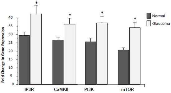 Here, we assessed whether there is any differential expression of additional Ca2+-related genes including IP3R, CaMKII, PI3K and mTOR using qRT-PCR. As illustrated in Figure 5, the average data of PI3K, mTOR, IP3R and CaMKII, transcription was detected at low levels in normal control LC cells, but significantly (* p < 0.05), up-regulated in glaucoma LC cells. Data are the average of three biological replicates comparing transcription of PI3K, mTOR, IP3R and CaMKII between normal controls to the age-matched glaucoma LC cells.