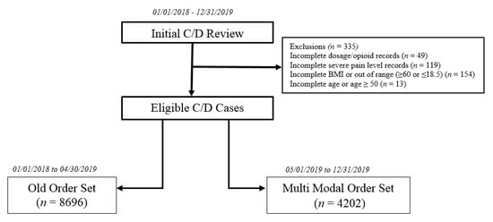 There were 13,233 cesarean deliveries during the study period (January 2018 to December 2019). After excluding 335 women with incomplete data, we assessed a total of 12,898 cesarean births, 8696 of which delivered before the implementation of the multimodal order set (between 1 January 2018, and 30 April 2019). There were 4202 cesarean deliveries in the post implementation period between 1 May 2019, and 31 December 2019 (multimodal order set). Figure 1 displays the study exclusion and assignment criteria. Comparison of baseline demographic and clinical characteristics is displayed in Table 2.