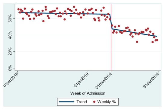An interrupted time series demonstrating the average percentage of patients that received opioids in the immediate post cesarean recovery throughout the study period is presented in Figure 2. In the initial study period (old order set), the proportion of inpatient post-cesarean opioid usage remained unchanged at approximately 67.5%. Upon implementation of the multimodal order set, an immediate drop was noticed to 45.4% (p < 0.001). Furthermore, following this abrupt decrease, a continuous mild reduction in opioid exposure is seen throughout the following eight months since implementation, at a range of 0.25% reduction per week (Figure 2).
