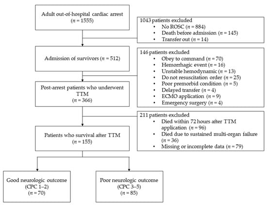 Patients with return of spontaneous circulation (ROSC) after out-of-hospital cardiac arrest have low survival rates and poor neurological prognosis despite active treatments, such as intensive care unit (ICU) care and targeted temperature management (TTM) []. Critically ill patients with hypoxic–ischemic insults during cardiac arrest may be further injured by myocardial dysfunction, impaired cerebral autoregulation, and systemic inflammatory reaction after ROSC. Consequently, patients are at a risk of multiorgan damage, including the nervous system damage [,,].