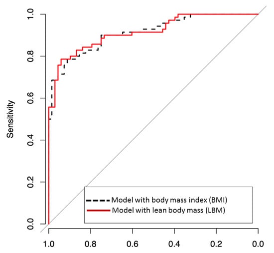 Receiver operating characteristic (ROC) curves for predicting good neurological outcome, defined as cerebral-performance categories 1–2, including body mass index (BMI) or lean body mass (LBM) in multivariate logistic models. Area under ROC curve (AUROC) was a good predictive value for BMI, and LBM predicted good neurological outcomes. The two models were not significantly different (AUROC of BMI vs. AUROC of LBM = 0.917 vs. 0.918, p-value = 0.8715).