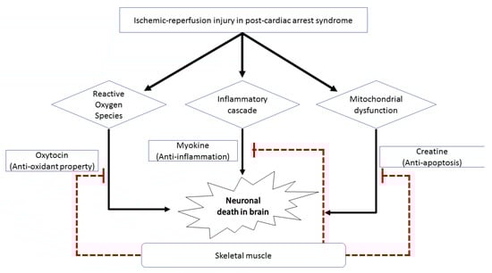 Schematic diagram showing the effects of skeletal muscle on the nervous system. Skeletal muscle can exhibit inhibitory effects on neuronal cell death in survivors after cardiac arrest via the (1) antioxidant property of oxytocin, (2) anti-inflammatory action of myokine, and (3) antiapoptotic activity of creatine.