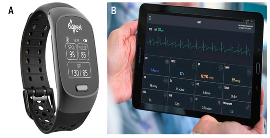 The Biobeat remote patient monitoring platform. (A)The wristwatch device. (B)Real-time measurement collected by the device.