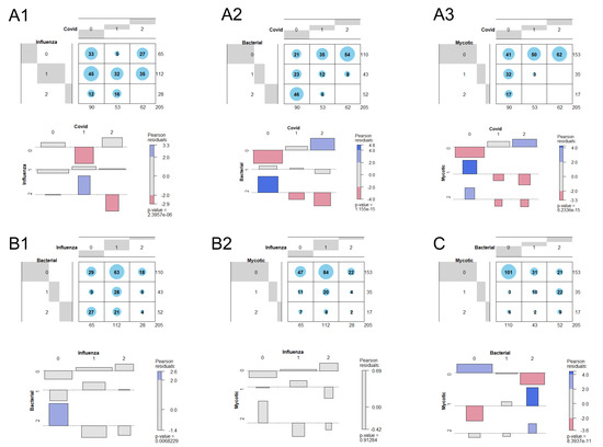 Dependencies of radiologists’ suspicion scores for different pathogen categories were screened by Pearson’s Chi2 Test for Independence (graphic illustration). Distribution of reading scores for every combination of pathogen category (influenza, COVID-19, bacterial, mycotic) are illustrated by 3 × 3 contingency tables. Cohen-Friendly Association Plots illustrate deviations from the statistically expected contingency table in the case of total independency. In the Cohen-Friendly Association Plot, each cell of the contingency table is represented by a rectangle that has a (signed) height proportional to its contribution to the Chi2 Statistic. Simultaneously, the area of the box is proportional to the difference in observed and expected frequencies. The rectangles in each row are positioned relative to a baseline indicating independence/no contribution to the Chi2 Statistic. If the observed frequency of a cell is greater than the expected one, the box rises above the baseline and is shaded in blue. Otherwise, the box falls below the baseline and is shaded in red. Discrepancies from the independency scenario are quantified by Pearson Residuals (PR), which can be interpreted as follows: −2 < PR < 2—no significant dependency/−4 < PR < −2 or 2 < PR < 4—significant dependency/PR < −4 or PR > 4—strong significant dependency. The displayed p-values are the noncorrected. Corresponding statistical analysis corrected for multiple testing by the Bonferroni method is illustrated in Table 3. Under-represented co-occurrent suspicions for mycotic/COVID-19 pneumonia or bacterial/COVID-19 pneumonia indicate specific image features of COVID-19 pneumonia (A2/A3). Contrarily, over-represented co-suspicions for bacterial/mycotic pneumonia indicate partially shared image features (C).