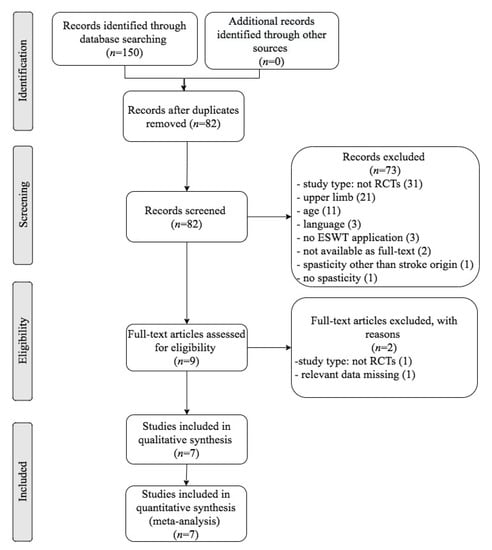 Through a scientific literature search, 150 references were found and 82 remained after duplicates removal. After screening of title and abstract, 73 studies did not meet the eligibility criteria. After assessing the eligibility of the nine remaining full-text articles, two of them were excluded. Eventually, seven randomized controlled trials (RCTs) were included for the meta-analysis: Tirbisch, 2015; Taheri et al., 2017; Yoon et al., 2017; Wu et al., 2017; Radinmehr et al., 2017; Lee et al., 2019; Radinmehr et al., 2019 [,,,,,,]. The Preferred Reporting Items for Systematic Reviews and Meta-Analyses (PRISMA) diagram (Figure 1) sums up the selection process and the results that were retrieved through literature search.