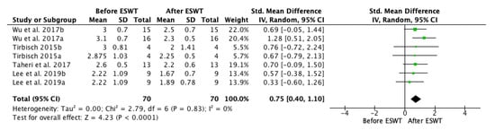 Multiple forest plots were performed while using the available analyzable data from the included studies, assessing the effects after ESWT application compared to the baseline. Additionally, control and experimental group comparisons were conducted.