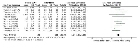 The forest plot for spasticity assessment by MAS before and after extracorporeal shock wave therapy showed a positive effect on the long-term, up to twelve weeks after the treatment. Five of the studies were eligible for the meta-analysis. The MAS grade was significantly decreased after ESWT intervention: standardized mean difference (SMD) = 1.34; 95% confidence interval (95% CI): (1.01–1.66); and, p < 0.00001) (Figure 3).