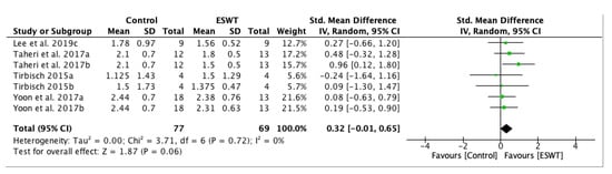 A forest plot for spasticity assessment by MAS on the long-term comparing the control group and experimental group after ESWT application was performed. Four studies and seven groups presented analyzable data and they were included in the meta-analysis. The MAS score was decreased in the experimental group, favouring ESWT application: standardized mean difference (SMD) = 0.32; 95% confidence interval (95% CI): (−0.01–0.65); p = 0.06 (Figure 4).