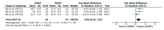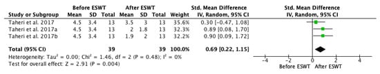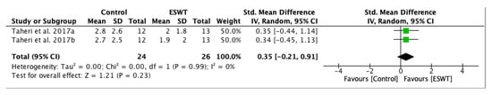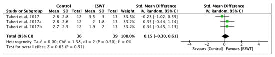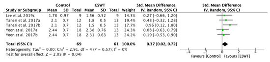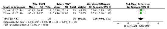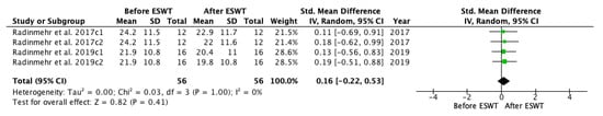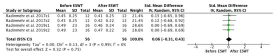 A meta-analysis on / ratio before and after ESWT intervention was conducted (Figure 11), showing that significant improvements were not found across assessments immediately and one hour after the treatment as compared to the baseline. The standardized mean difference (SMD) = 0.06; 95% confidence interval (95% CI): (−0.31–0.43); p = 0.75.
