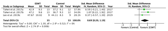 For the assessment of long-term effects of ESWT intervention on PROM, two studies, including three groups, were selected for meta-analysis (Figure 12). A statistically significant effect favouring ESWT was found when comparing the control and the experimental group, showing that the effects lasted up to twelve weeks after the treatment. The standardized mean difference (SMD) = 0.69; 95% confidence interval (95% CI): [0.20–1.19]; p = 0.006.