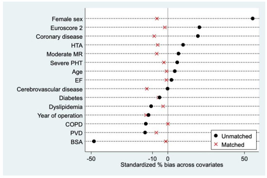 Patients who received a 19 mm valve were matched 1:1 to those receiving a 21 mm prosthesis with a 0.2 standard deviation caliper by matching without replacement using the “psmatch2” statistical package in Stata. Matching covariates were the following: year of operation, age, sex, body surface area, EuroSCORE II surgical risk score, ejection fraction, severe pulmonary hypertension, residual ≥ grade 2 mitral regurgitation, coronary artery disease, dyslipidemia, arterial hypertension, chronic obstructive pulmonary dysfunction, diabetes, peripheral vascular disease, and cerebrovascular disease. Matching resulted in a 252-patient cohort. The average treatment on the treated is estimated from this sample. Covariate balance was assessed after matching by assessing the standardized percent bias, with less than 10% considered acceptable (Figure 1).