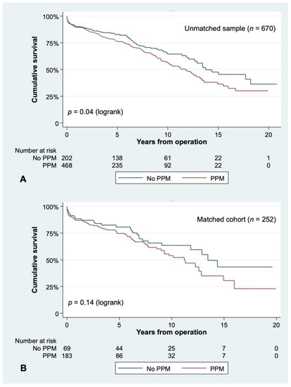 Long-term survival according to the presence of PPM (EOAi ≤ 0.85 cm2/m2) in the unmatched (A) or matched (B) sample. When matching for risk factors, there was no difference in survival.