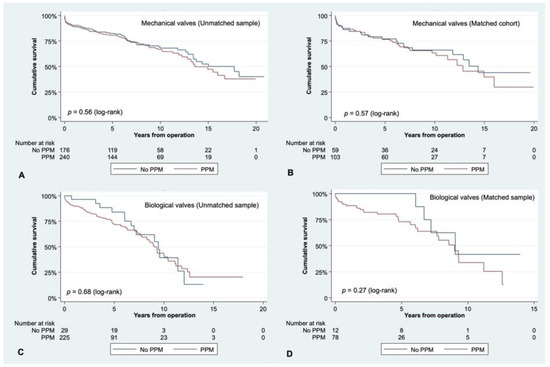 Long-term survival according to the presence of PPM (EOAi ≤ 0.85 cm2/m2)for mechanical valves recipients in the unmatched (A) or matched sample (B), as well as biologic valve patients in the unmatched (C) or propensity-matched sample (D).