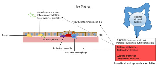 The commensal microbiota, or microorganisms that normally inhabit the human body, potentially provide a missing link between the genetic and environmental factors that contribute to AMD pathogenesis. The vast majority of the human commensal microbiota is composed of bacteria located in the gastrointestinal tract, which are now known to be integrally involved in host biological processes such as control of the immune system, breakdown of lipids found in the diet, and the formation and metabolism of bile acids. Metabolites and other components produced by or expressed on the commensal bacteria have wide-spanning functions, including modifying host leukocyte trafficking within the adaptive immune compartment and activating crucial innate pathways within the gut, such as complement and the NLRP3 inflammasome [11]. Because of these integrated functions with the host, an intestinal dysbiosis, or alterations in the balance of commensals favoring inflammation or disease, has been demonstrated in several diseases, including type 1 diabetes, atherosclerosis, inflammatory bowel disease (IBD), rheumatoid arthritis (RA), multiple sclerosis (MS), and, recently, AMD [19,20,21,22,23,24].