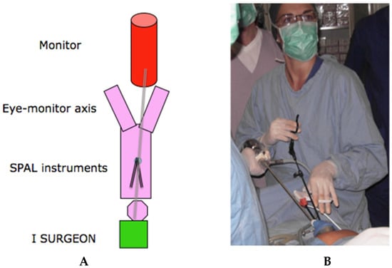 To provide an ergonomic eyes–hands–monitor axis, the first surgeon stands at the head of the patient using two (left and central) port accesses. The assistant stands at the level of the patients’ right shoulder holding the endoscope in the right port access and the monitor is placed between the patient’s legs (Figure 1A,B).