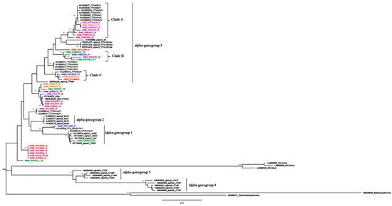 The UTRB region was successfully amplified in 43 of 73 TTV DNA positive samples detected by the Biomérieux assay. Multiple TTV isolates were detected in 10 samples, probably due to co-infections, complicated sequence identification, thus, phylogenetic analysis was performed using 33 sequences. References for TTV alpha-genogroup 1 (genogroup1) to 5 were included in the phylogenetic analysis (Supplemental Materials Tables S1 and S2). A phylogenetic tree was constructed employing the maximum-likelihood method (Figure 1). TTV alpha-genogroups included genogroup3 (n = 13), genogroup1 (n = 2), and undetermined genogroup strains (n = 18). Genogroup1 strains were observed only in untreated patients: one in the F1 group and the other in the F2 group, while genogroup3 isolates were found in all groups. The genogroup3 strains were grouped into three different clades. Both strains from coinfected patients and those from monoinfected patients were found in all three clades. In clade A, sequences shared a similarity of 81.1%, in clade B, 79.6%, and in clade C, 90.8%. PtINMI_CUOW had a 75.3% similarity with AY823988, an alpha-genogroup3 reference sequence.