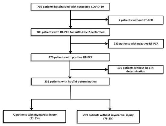 A total of 705 subjects were tested for COVID-19 from 15 March to 30 April 2020. Results of the PCR test were missing in 2 patients and were negative in 233. Out of the positive patients, only 331 have a determination of hs-cTnI during hospitalization and they were eventually entered in this analysis. Myocardial injury, defined as at least one value of hs-cTnI above the 99th percentile upper reference limit, was detected in 72 patients (21.8%) (Figure 1). The median (IQR) time from the beginning of symptoms to Hs-cTnI peak was 7.0 (3.0–13.0) days in the patients with myocardial injury.