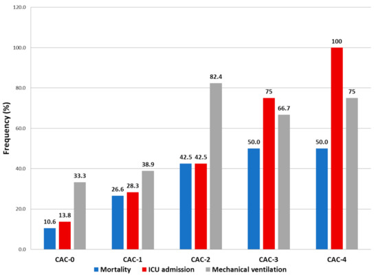 The CAC score was higher in patients with myocardial injury (1 (0–2) vs. 0 (0–1), p = 0.001), with at least one parameter of CAC in 72.2% of the patients with myocardial injury vs. 49.4% of the patients without. A higher CAC score was associated with higher rates of ICU admission, mechanical ventilation and all-cause mortality (Figure 2).