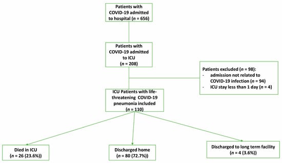 From March 1st to 29 May 2020, one-hundred and ten adult patients with acute respiratory failure caused by COVID-19 infection were admitted to the ICU and were included in this study (Figure 1). The main characteristics of the cohort are summarized in Table 1. The median age among all patients was 49 years (IQR: 40–58 years), and 99 (90%) were men. Among the patients, 70 (63.6%) had at least one comorbidity, 76 (69%) received IMV, 68 (62%) required vasopressor support, and 28 (25.5%) received RRT. All our included patients were immunocompetent, none had any cancer or was on immunosuppressive treatment. The median time from symptoms onset to ICU admission was 5 days (IQR: 3–7 days).