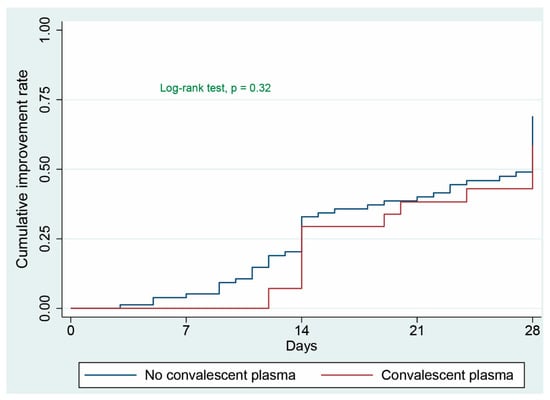 Overall, 62 patients (56.5%) experienced clinical improvement by day-28. In univariate analysis (without adjustment), CP was not associated with time to clinical improvement (HR = 0.75 (95%CI: 0.41–1.37), p = 0.35) (Figure 2 and Table S1).