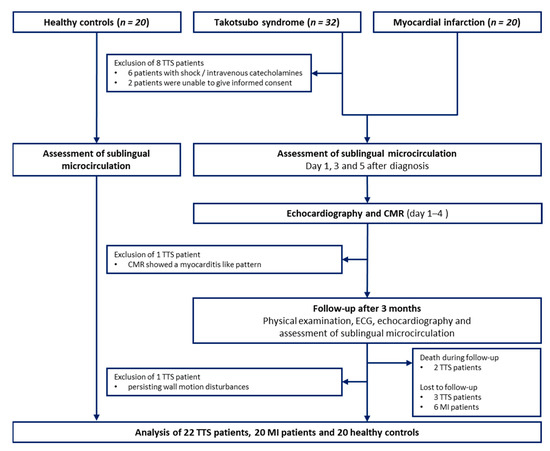 The study was performed between January 2016 and December 2018 at the University Heart Center Lübeck, Department of Cardiology, Angiology and Intensive Care Medicine. A total of 32 TTS patients fulfilling the proposed diagnostic criteria from the Taskforce on TTS of the Heart Failure Association of the European Society of Cardiology [1] were prospectively enrolled. The control groups consisted of 20 prospectively enrolled, age- (+/− 5 years) and gender-matched patients with acute MI (defined according to current guidelines requiring cardiac biomarker elevation and a documented coronary culprit lesion [12]) and 20 unmatched healthy subjects. A detailed overview is provided as a study flow chart in Figure 1.