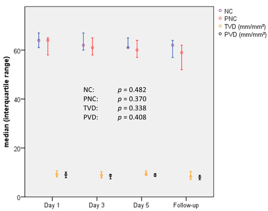 Chronological sequence of MC parameters in TTS patients: The measured parameters did not show any significant change during the observation period. Values are median (interquartile range). MC = microcirculation, NC = number of vessel crossings, PNC = number of perfused vessel crossings, TVD = total vessel density, PVD = perfused vessel density.