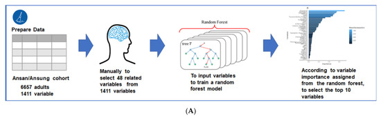 The present study was conducted in three parts (Figure 1). First, the sample sizes of the training and testing sets were determined using the G-power test in the criteria of effect size, power, and significance level at 0.1, 0.01, and 0.99, respectively. A sample size of 656 was found to be suitable. Thus, the testing set was defined as 10% of the Ansan/Ansung cohort (n = 666). We manually excluded participants with missing values and duplicates from the 1411 in the Ansan/Ansung cohort. Forty-eight variables were used to train a random forest algorithm to predict SMM and rated in order of importance. In order to reduce the number of variables required to predict SMM using the machine learning approach, we removed the variables one by one from low to high importance and iteratively trained the random forest model until the mean square errors (MSEs) of the model did not decrease significantly after eliminating one variable each. Finally, when the top 10 variables had been identified (Figure 1A), we applied the same screening method to the prediction of FM.
