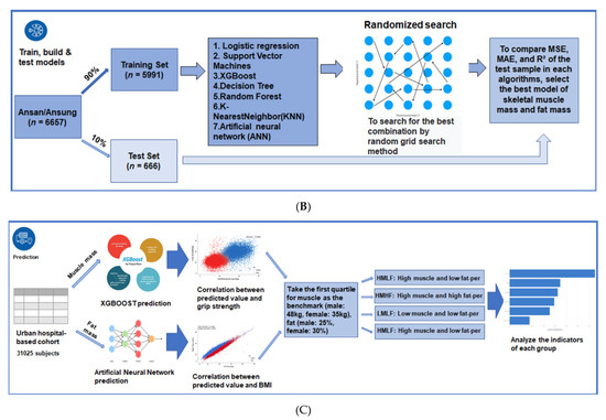 Experimental flowchart. (A) Flow to filter features for SMM and FM in Ansan/Ansung cohort. (B) Flow to generate the best model by a random grid model in the training set and checking the error in the test set. (C) Flow to analyze clinical characteristics of the participants with high or low skeletal muscle mass (SMM) and fat mass (FM) of the urban hospital-based cohort.