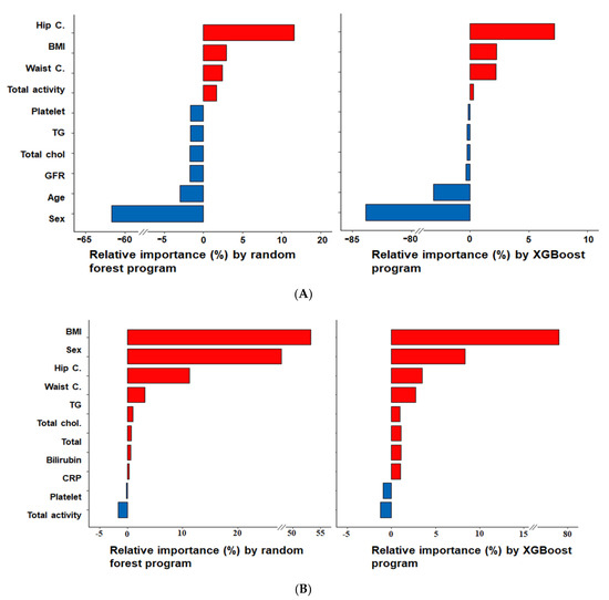 Random forest and XGBoost algorithms in the seven trained ones returned the importance of features (Figure 2A,B). Of these features, hip circumferences and BMI were the most important predictors for SMM, whereas BMI and gender were for FM. According to the linear regression analysis, hip circumference, BMI, waist circumference, and total activity were positively associated with SMM, whereas age, glomerular filtration rate (GFR), female gender, and serum concentrations of total cholesterol, triglyceride, and platelets exhibited negative associations (Figure 2A). FM was predicted using the method used for SMM. Parameters with high relative importance were BMI, gender, hip circumference, and waist circumference in both algorithms, such as random forest and XGBoost. BMI, female, hip circumference, waist circumference, and serum triglyceride, total cholesterol, total bilirubin, and CRP concentration positively influenced FM prediction. However, serum platelet concentrations and total activity were negatively affected by physical activity serum platelet concentration (Figure 2B).