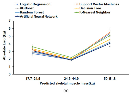 The random forest prediction model was applied to seven machine learning algorithms (Table 2, Figure 3A,B). Predicted SMM had an absolute error of 7% in the test set. XGBoost was the best predictive model for SMM. Predicted SMM by XGBoost was divided into three groups by 20th and 80th percentiles. Mean square errors were lowest in the 20th–80th group for SMM prediction, and the absolute error was <2%. Mean square errors were higher in the <20th and >80th percentile groups than in the 20th–80th percentile. Linear regression, XGBoost, random forest, and ANN models showed the lowest absolute errors. Since the absolute error of the best prediction model for SMM was highest in the <20th percentile group, it was unsuitable for subjects with a low SMM (Figure 3A).