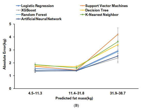 Absolute errors of SMM prediction with ranges in the test set for the seven machine learning algorithms. (A) Skeletal muscle mass (SMM); (B) fat mass (FM). Absolute errors were calculated by subtracting actual values from predicted values. The SMM and FM were divided into quintiles and Q1, Q2–Q4, and Q5. The absolute errors of predicted SMM and FM by XGBoost and ANN models were calculated in each of these three ranges.