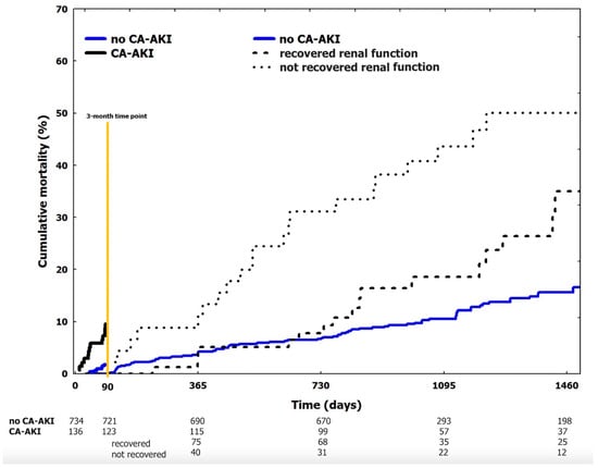 Overall, 844 patients reached the 3-month time point. Afterwards, 134 (16%) patients died. In particular, 96 (13%) patients belonged to the no CA-AKI group, 17 (22%) to the recovered renal function group and 21 (47%) to the not recovered renal function group (p < 0.001). Unadjusted cumulative mortality beyond 3 months was higher in patients with not recovered renal function (p = 0.008 vs. recovered renal function group and p < 0.001 vs. no CA-AKI group) (Figure 1). After correction for potential confounding factors, the not recovered renal function group remained associated with an increased risk of mortality as compared to recovered renal function group and no CA-AKI subgroups (HR 2.01, 95%CI 1.55–2.59, p = 0.009 and HR 2.71, 95%CI 1.45–5.89, p < 0.001, respectively). As compared to the no CA-AKI group, unadjusted cumulative mortality beyond the 3-month marker was higher in patients with recovered renal function (p = 0.043) (Figure 1). After correction for potential confounding factors, the difference was not significant (HR 1.07, 95%CI 0.61–1.91, p = 0.751) and patients of the recovered renal function group were not associated with a higher risk of mortality after the 3-month timepoint.