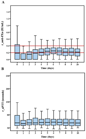 Time courses of reference anti-FXa and aPTT. Tuckey diagrams showing the daily values of reference anti-FXa (A) and reference aPTT (B) used for the association analysis. Anti-FXa was the reference test for anticoagulation monitoring and the red lines (A) describe the targeted anti-FXa interval.