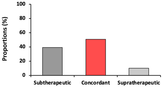 The concordance of actual r_aPTT values with expected aPTT range that corresponds to r_anti-FXa range of [0.30 to 0.70 IU/mL] was 50.7%. Expected r_aPTT values were markedly sub-therapeutic (39.3%) (Figure 2).