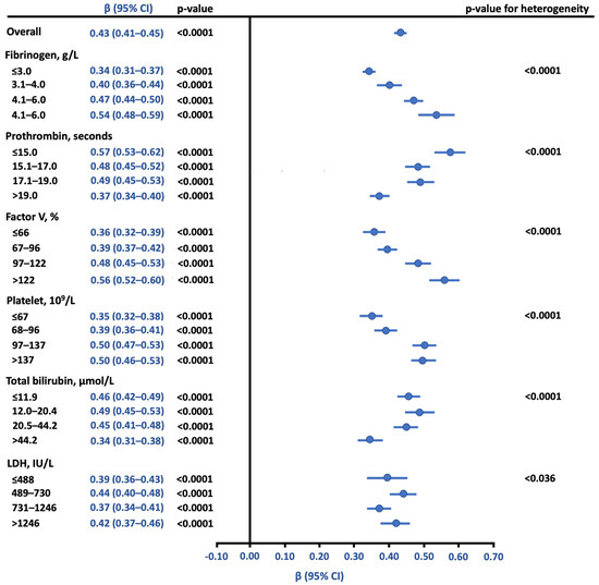 Association of anti-FXa and aPTT, overall and after modulation by biological covariates. β indicates regression coefficient of aPTT on anti-FXa (expressed as 10−2 IU/mL) calculated using all available biological measures at the same time points by using linear mixed model (unstructured covariance pattern model to account repeated measurements). Subgroups analyses on other biological data (categorised according to quartiles of all available measures) were made by including the corresponding interaction term into linear mixed models. Prothrombin time (PT), factor V and fibrinogen were analysed on the same citrated samples as aPTT and Anti-FXa. Platelets, bilirubin and lactate dehydrogenase samples were drawn at the same time point as aPTT and Anti-FXa.