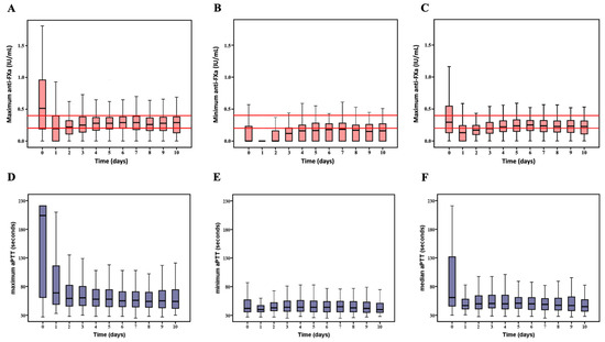 Time courses of daily maximum, minimum and mean values of anti-FXa and aPTT. The pink Tuckey diagrams showing the time course of the daily maximum (A) minimum (B) and mean (C) values of anti-FXa. The reference line for the lower and the upper limit of the anti-FXa used in our centre are coloured red. The bleu Tuckey diagrams showing maximum (D), minimum (E) and mean (F) values of aPTT.