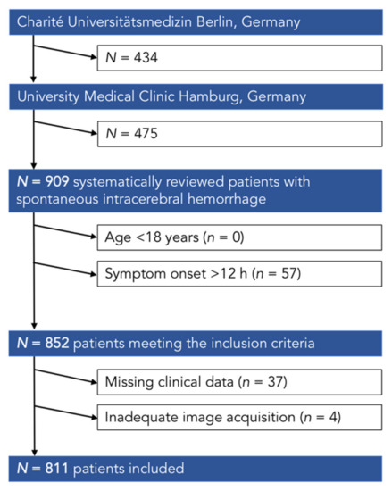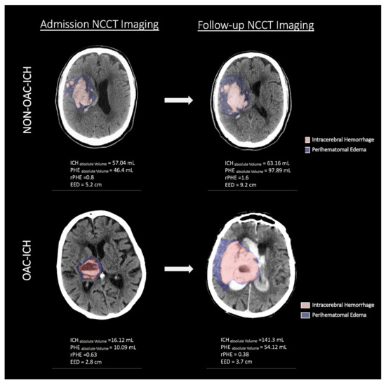 - Staykov, D.; Wagner, I.; Volbers, B.; Hauer, E.-M.; Doerfler, A.; Schwab, S.; Bardutzky, J. Natural Course of Perihemorrhagic Edema After Intracerebral Hemorrhage. Stroke 2011, 42, 2625–2629. [Google Scholar] [CrossRef]