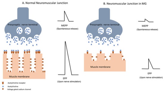 Neuromuscular transmission in normal individuals (A) and in patients with MG (B). Decreased density of the AChR and complement-mediated damage to the postsynaptic membrane in MG patients result in decrease in miniature end plate potential (MEPP), which occurs with spontaneous release of AChR vesicles, as well as endplate potential (EPP) in response to nerve action potential of the presynaptic membrane. Diminished amplitude of EPP in MG results in impaired neuromuscular transmission.