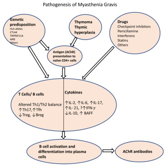 MG is uniquely associated with thymus hyperplasia and thymoma. The presence of ectopic germinal centers is associated with early-onset AChR-MG, but not with MuSK-associated MG. The T cell selection process may be impaired in thymic hyperplasia and thymoma. The latter can have defective AIRE expression and can lack thymic medulla, which is involved in the negative selection of T cells, therefore contributing to the release of autoreactive CD4+ and CD8+ T cells []. In addition, the ensuing T cell subset imbalance and cytokine dysregulation leads to the activation of B cells in germinal centers and differentiation into autoreactive B cells and plasma cells []. T follicular helper cells (Tfh), which are required for the generation of germinal centers, produce IL-21 and induce immunoglobulin class switching []. Microarray analysis in thymic T cells from MG patients revealed a Th1/Th17/Tfh signature [].
