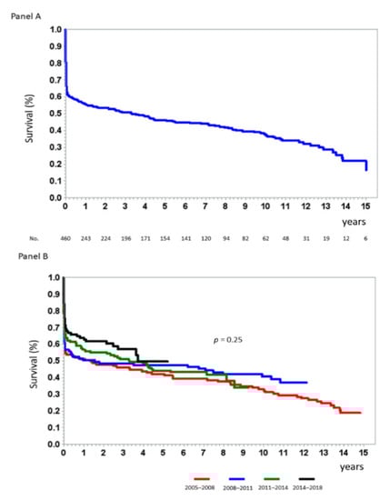 The median long-term follow-up was 4 (2.0–5.2) years. The cumulative mortality of the study population was 60% (n = 281) (Figure 1).