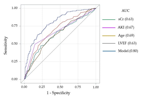 Receiving operating characteristic curves and corresponding area under the curves (AUC) for long-term mortality of each independent predictor considered separately and in combination (Model). AKI = acute kidney injury; LVEF = left ventricular ejection fraction; sCr = serum creatinine concentration.